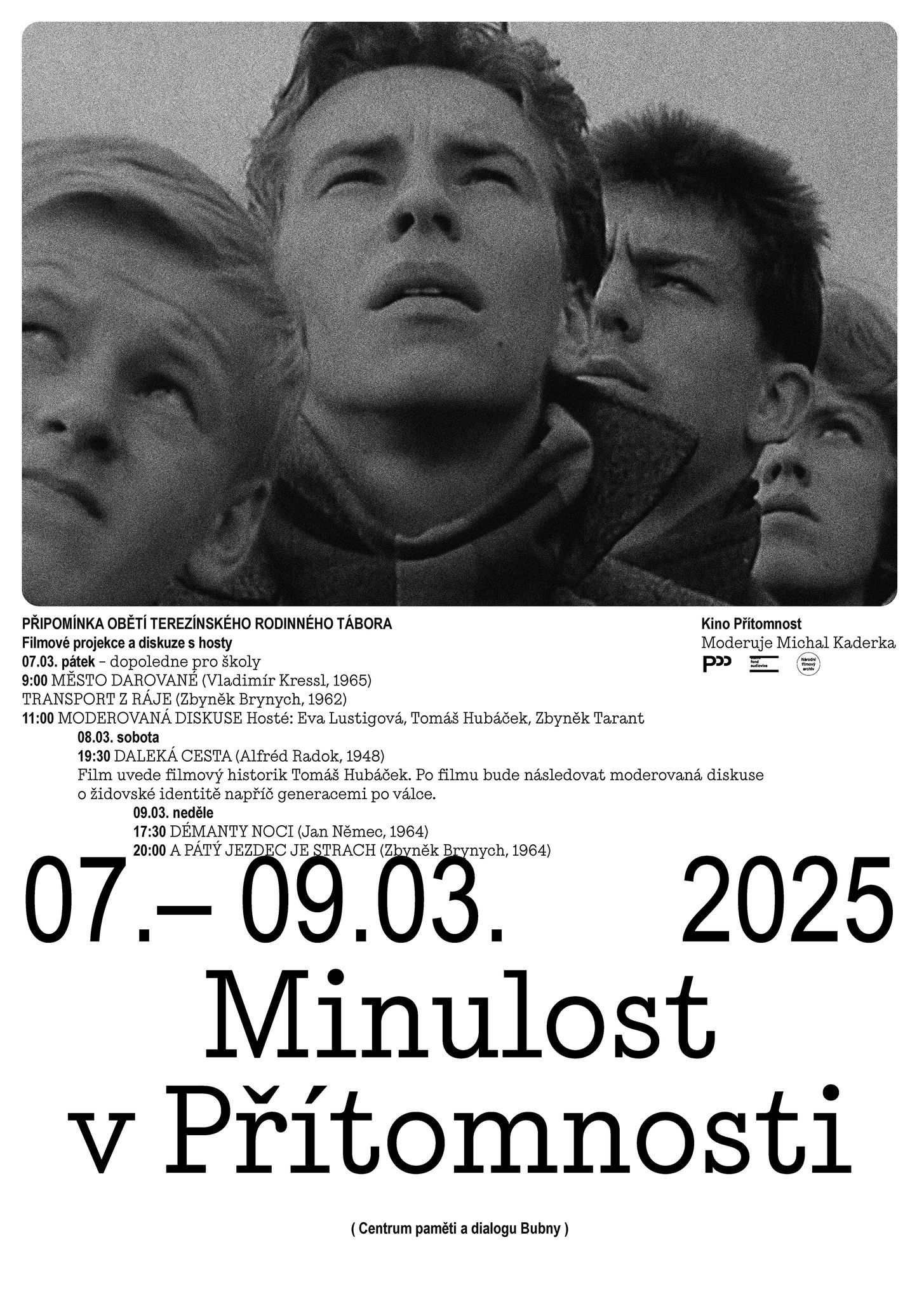 Centrum paměti a dialogu Bubny pořádá od pátku 7. března do neděle 9. března filmovou přehlídku, která připomene oběti takzvaného terezínského rodinného tábora. Pět filmů, mezi doprovodí v pátek a v sobotu diskuze s hosty filmografem Tomášem Hubáčkem, historikem Zbyňkem Tarantem a potomky přeživších z různých generací. Podrobnosti si poslechněte v rozhovoru Rádia Prostor s ředitelkou Centra Pavlínou Šulcovou.